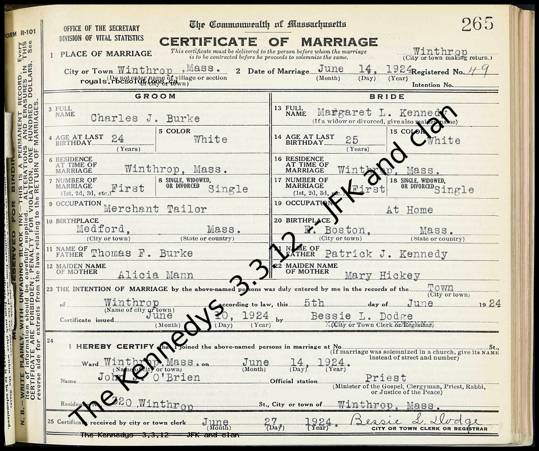Sex Male Age 24 Birth Year (Estimated) 1900 Race White Father's Name Thomas F. Burke Father's Sex Male Mother's Name Alicia Mann Mother's Sex Female Spouse's Name Margaret L. Kennedy Spouse's Sex Female Spouse's Age 25 Spouse's Birth Year (Estimated) 1899 Spouse's Race White Spouse's Father's Name Patrick J. Kennedy Spouse's Father's Sex Male Spouse's Mother's Name Mary Hickey Marriage Date 14 Jun 1924 Marriage Place Winthrop, Suffolk, Massachusetts, United States Marriage Place (Original) Winthrop Event Type Marriage Certificate Number 49 Charles J. Burke's Parents and Siblings Thomas F. Burke - Father - M Alicia Mann - Mother - F Charles J. Burke's Spouses and Children Margaret L. Kennedy - Wife - F - 25 Other People on This Record Patrick J. Kennedy - M Mary Hickey - F | ||||||||||||||||||||||||||||||||||||||||||||||||||||||||||||||||||||||||