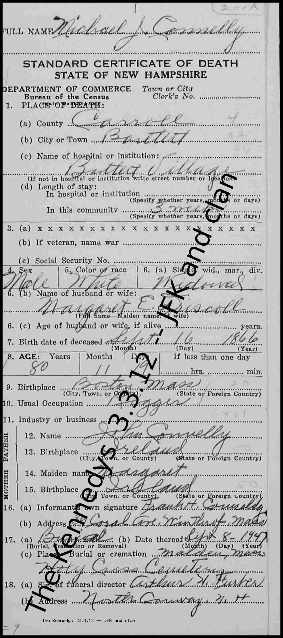 Sex Male Age 80 Death Date 5 Sep 1947 Death Place Bartlett, Carroll, New Hampshire, United States Death Place (Original) Bartlett, Carroll, New Hampshire, U.S.A Birth Year (Estimated) 1867 Father's Name John Connelly Father's Sex Male Mother's Name Margaret Mother's Sex Female Spouse's Name Margaret E. Driscoll Spouse's Sex Female Event Type Death Michael J. Connelly's Parents and Siblings John Connelly - Father Margaret - Mother Michael J. Connelly's Spouses and Children Margaret E. Driscoll - Wife |