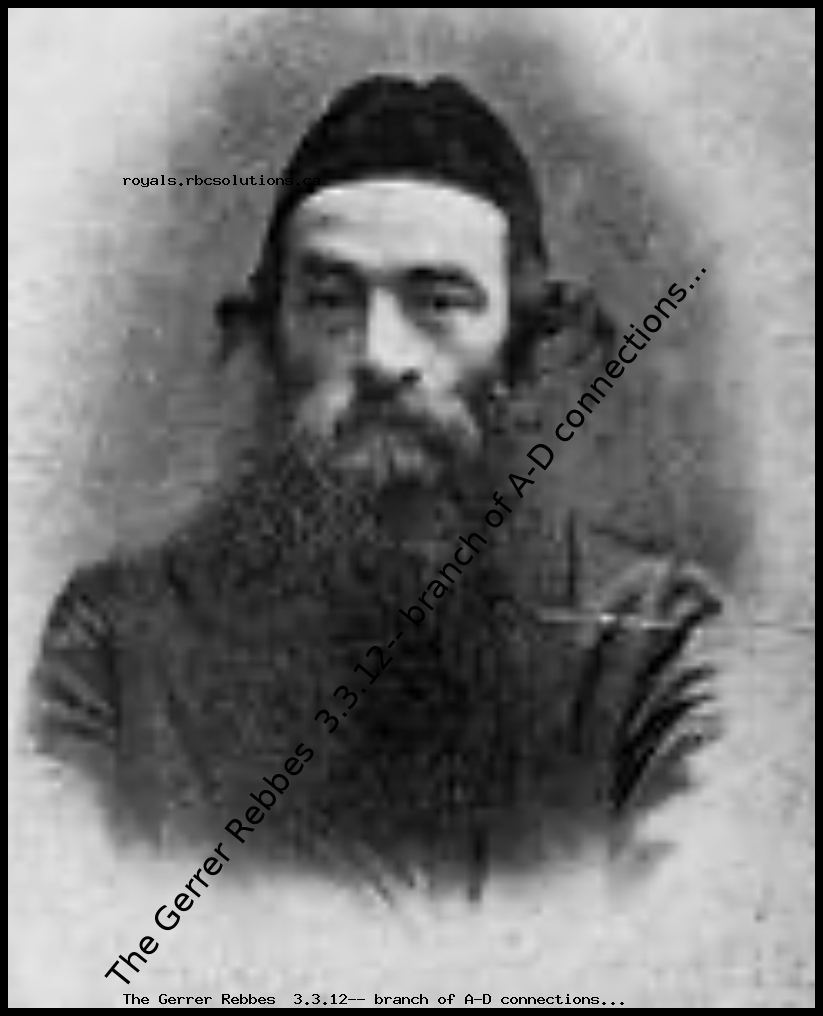 You →Ruth ALTER COHEN your mother →Louis Mordecai ALTER her father →Harry ALTER his brother →Frances ALTER SALEM his daughter →Beverley SALEM PASTERNAK her daughter →Harvey Stephen PASTERNAK her husband →Louis PASTERNAK his father →Favel PASTERNAK his father →Chaim Yosef (Hyman) Pasternak his brother →<private> PASTERNAK HALBERSTAM his daughter →<private> HALBERSTAM her husband →Binyamin TEITELBAUM HALBERSTAM his father →Yocheved Rivka HALBERSTAM TEITELBAUM his mother →Reizel HALBERSTAM EICHENSTEIN-CHODOROV-ALTER her sister →R' Judah Arye Leib ALTER, Sfas Emes, Admor 2nd Gerrer her husband →R' Avraham Mordechai ALTER, 3rd Admur Ger his son →R' Yisroel ALTER, 4th Gerrer Rebbe his son →Chaya Sarah BIDERMAN ALTER his wife |